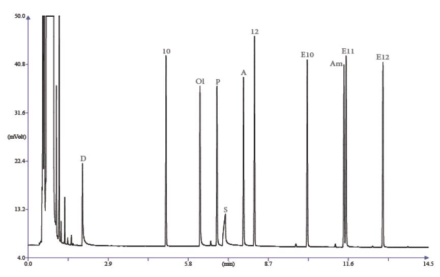 成份:2,3- 丁二醇(D)、癸烷(10)、1- 辛醇(Ol)、2,6- 二甲基苯酚 (P)、2- 乙基己酸 (S)、2,6- 二甲基苯胺 (A)、十二烷 (12)、癸酸甲酯
