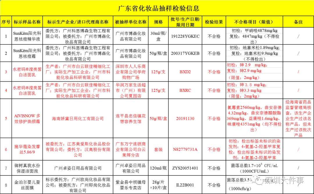深圳市人人樂商業(yè)有限公司學(xué)府購物廣場銷售的、廣州市科能化妝品科研有限公司生產(chǎn)的水密碼瀅亮皙白潔面乳,初檢、復(fù)檢的砷含量檢出值均為2.9 mg/kg;