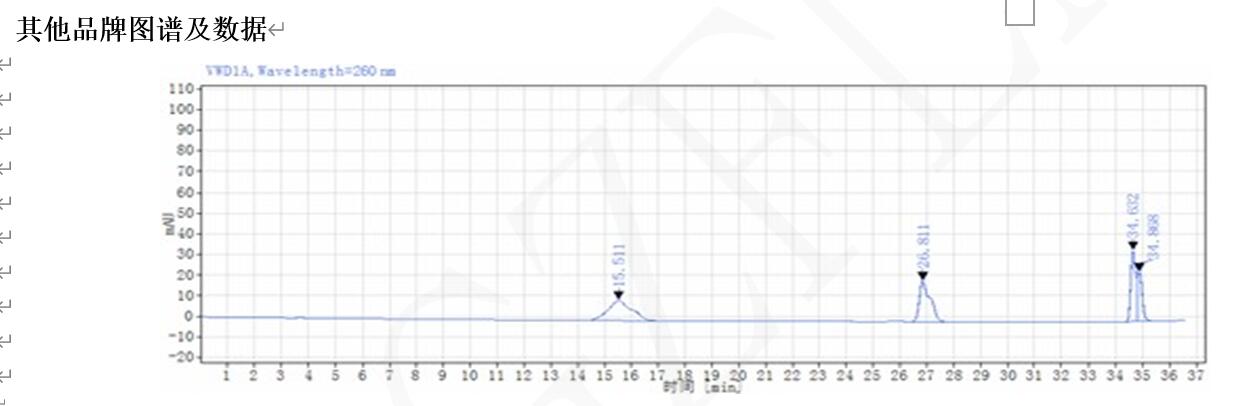 而本方法中更是使用了 100%水相 ,使用 TitankC18 與其他品牌色譜柱對比,發(fā)現(xiàn) TitankC18 色譜柱峰型及壽命 優(yōu) 于 其 他 品 牌 色 譜 柱 。 該 流 動 相 體 系 適 合 轉(zhuǎn) 換 成 LC-MS 檢 測 。