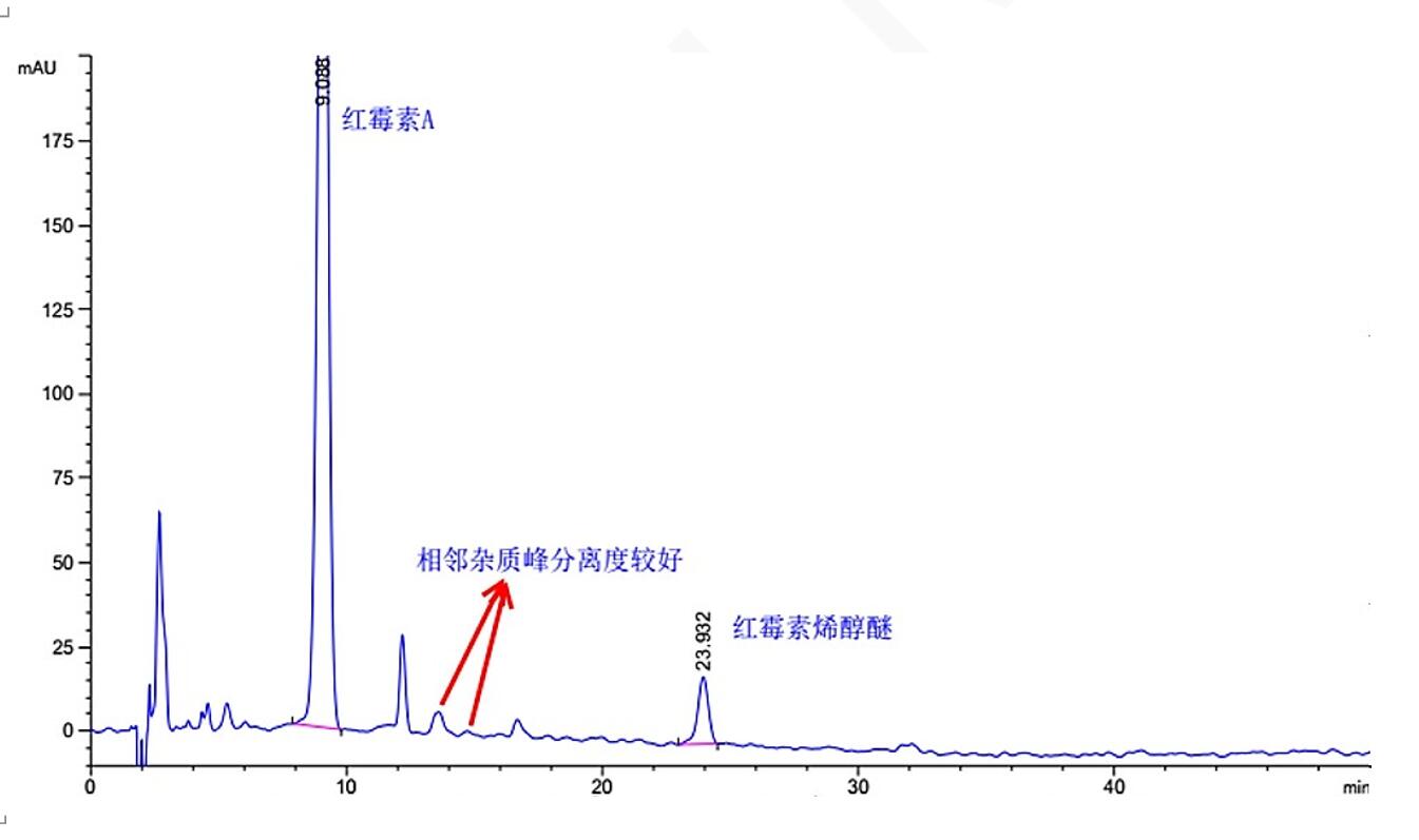 注:該方法要求紅霉素 A 峰與紅霉素烯醇醚峰的分離度應大于 14.0,紅霉素 A 峰的拖尾因子應小于 2.0。Titank C18 色譜柱分離度可達 20.19,拖尾因子 0.912,且對一些相鄰雜質峰有更好的分離效果。