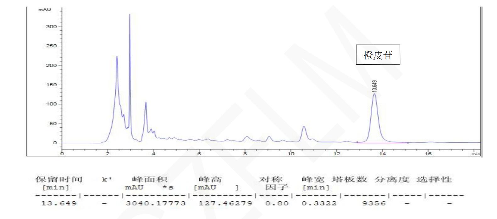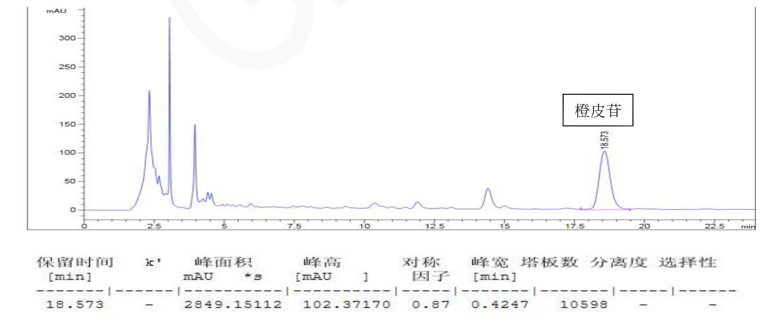 方法說明:使用 SuperLu C18 和 Superlu C18-AQ 兩款色譜柱進行嘗試,兩者均能滿足中國藥典要求,需注意的是,分析橙皮苷時采用的是 20%乙腈等度洗脫,會導致一些保留較強的雜質無法洗脫而殘留在柱子, 建議走完藥典規(guī)定的等度出峰后,最后升高有機相比例將其余雜質洗脫出,避免影響柱子壽命及重現性。