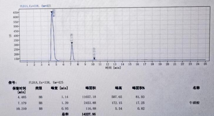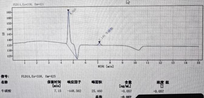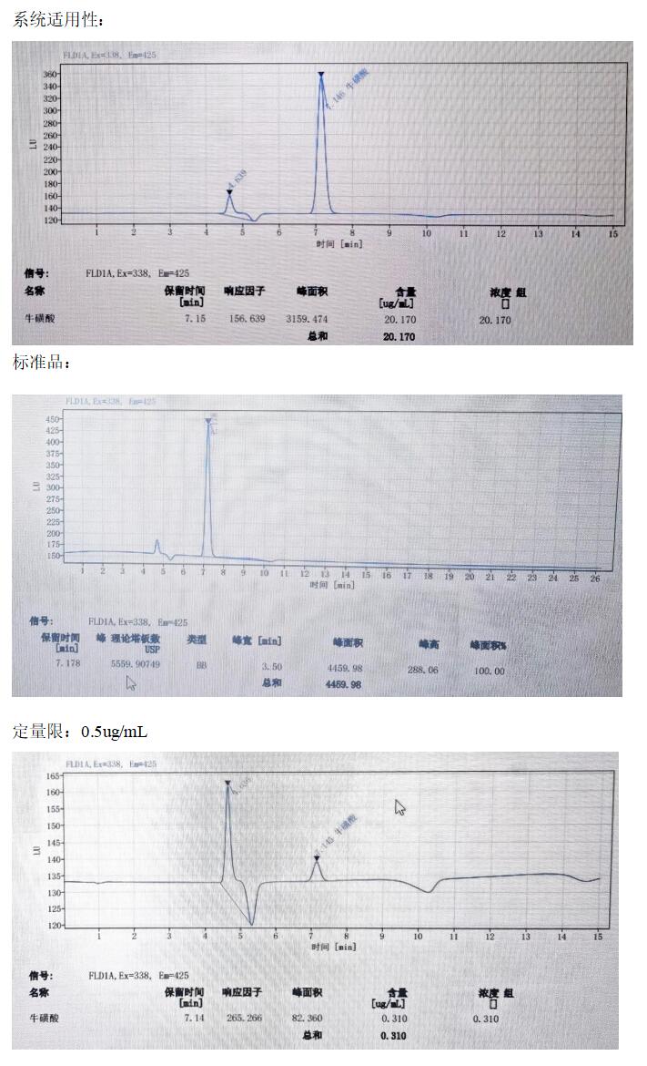 用?;撬針藰幼鲋噩F(xiàn)性實驗,用 20ug/mL 濃度的標樣 6 針,其保留時間的相對標準偏差(RSD)是 0.062%, 峰面積的相對標準偏差(RSD)是 0.126%。