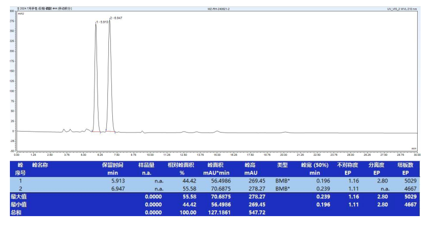 App ID: FLM-B240008 Chiral MZ(2)-RH 手性柱對阿瑞匹坦對映異構(gòu)體檢測 方法:自定 色譜柱:Chiral MZ(2)-RH 5u 250*4.6mm (貨號:FMG-AC5-B02-R) 流速:0.8 mL/min 檢測:UV210nm, 25oC 樣品濃度:1 mg/mL 進樣量:3 μL 溶劑:異丙醇 色譜圖: