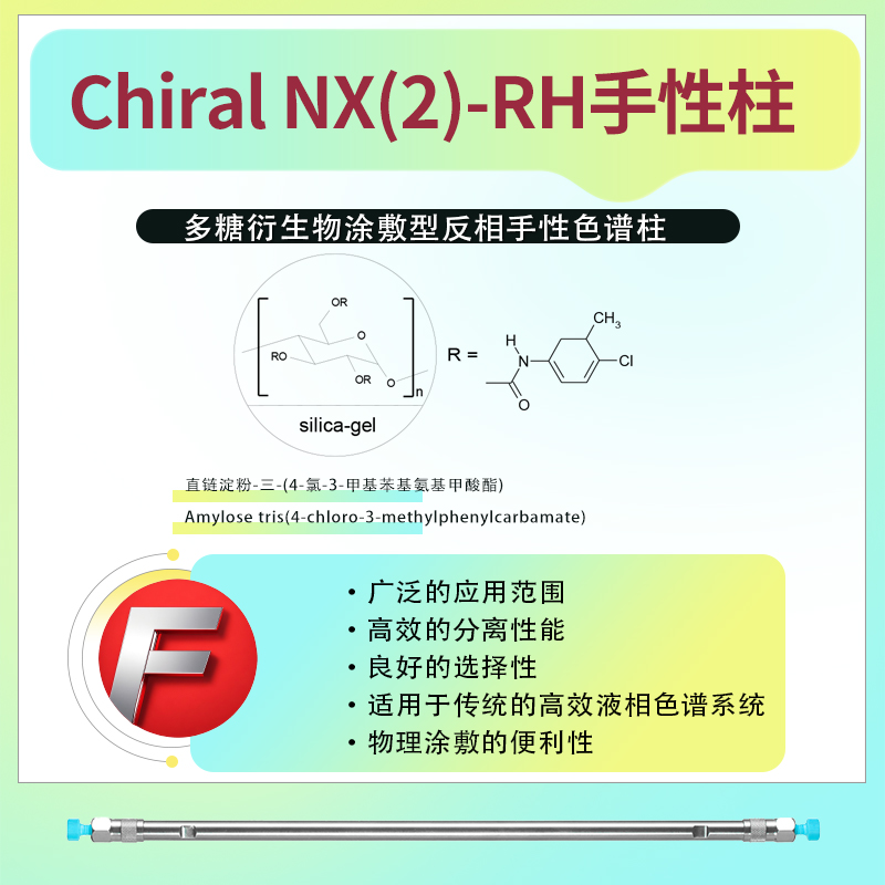 Chiral NX(2)-RH反相手性柱的固定相為直鏈淀粉-三-(4-氯-3-甲基苯基氨基甲酸酯)(Amylose tris(4-chloro-3-methylphenylcarbamate))。這種固定相具有獨特的光學活性,能夠對手性化合物進行高效識別和分離。