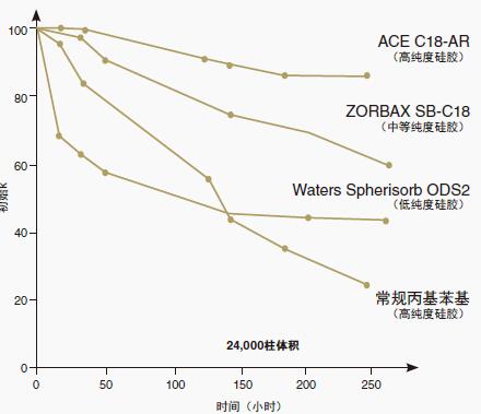 由于使用超高純度的硅膠固定載體粒子以及鍵合相的極高表面覆蓋,ACE鍵合相表現出極高的穩定性。(參見圖9)
